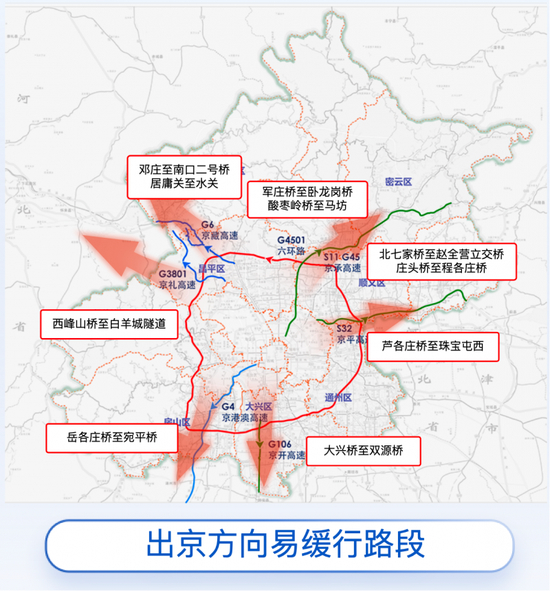 10月1日(假期首日)出京方向交通壓力大,預計全日交通量達假期峰值。其中上午8-12時高速公路出京方向交通壓力集中,9-11時最為突出。京藏、京承、京禮、京平、京港澳、京開等放射線高速公路為主力承壓通道,西六環、北六環外環路段承壓明顯。